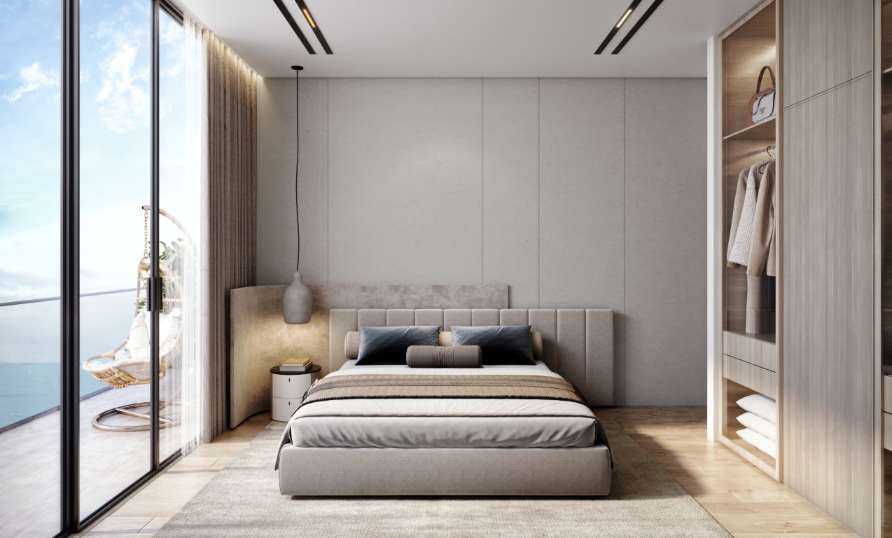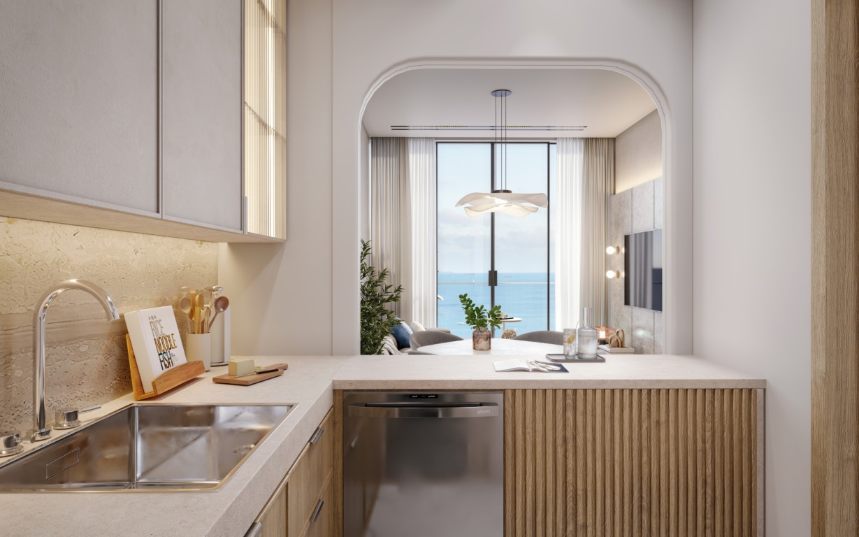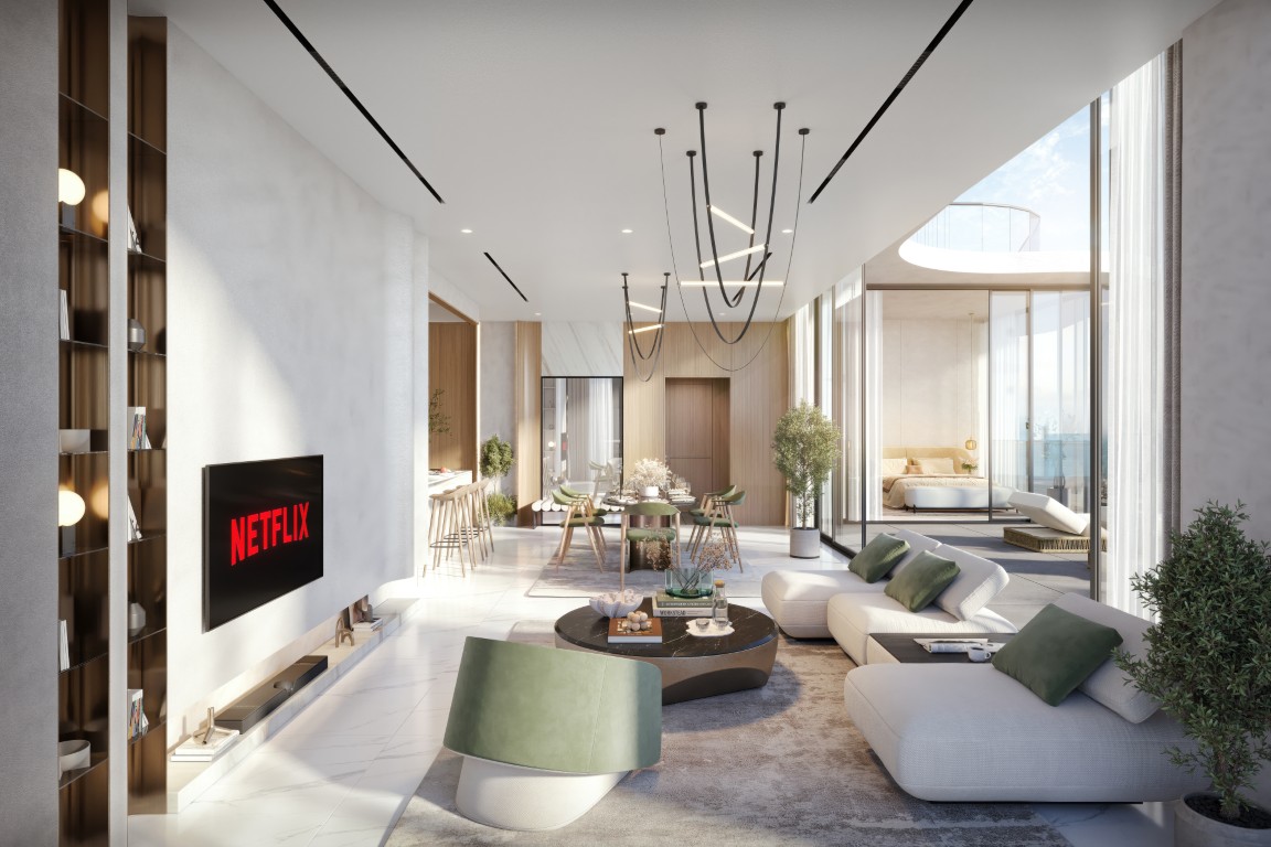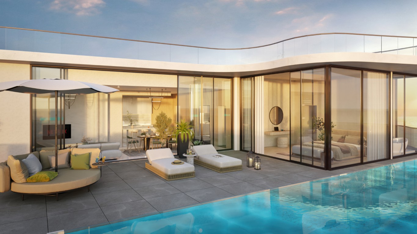 The tower rests on a landscaped podium and features a wave-inspired, balcony-led façade. Subtle lighting and earthly tones lend the building a warm, sophisticated presence, seamlessly connected to its coastal surroundings.