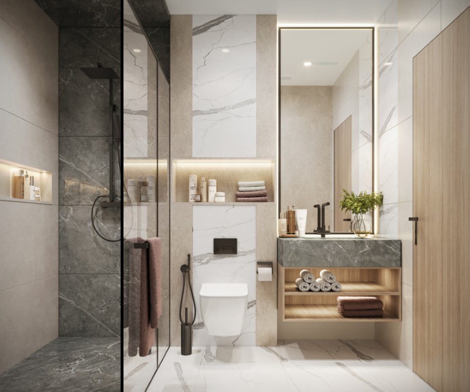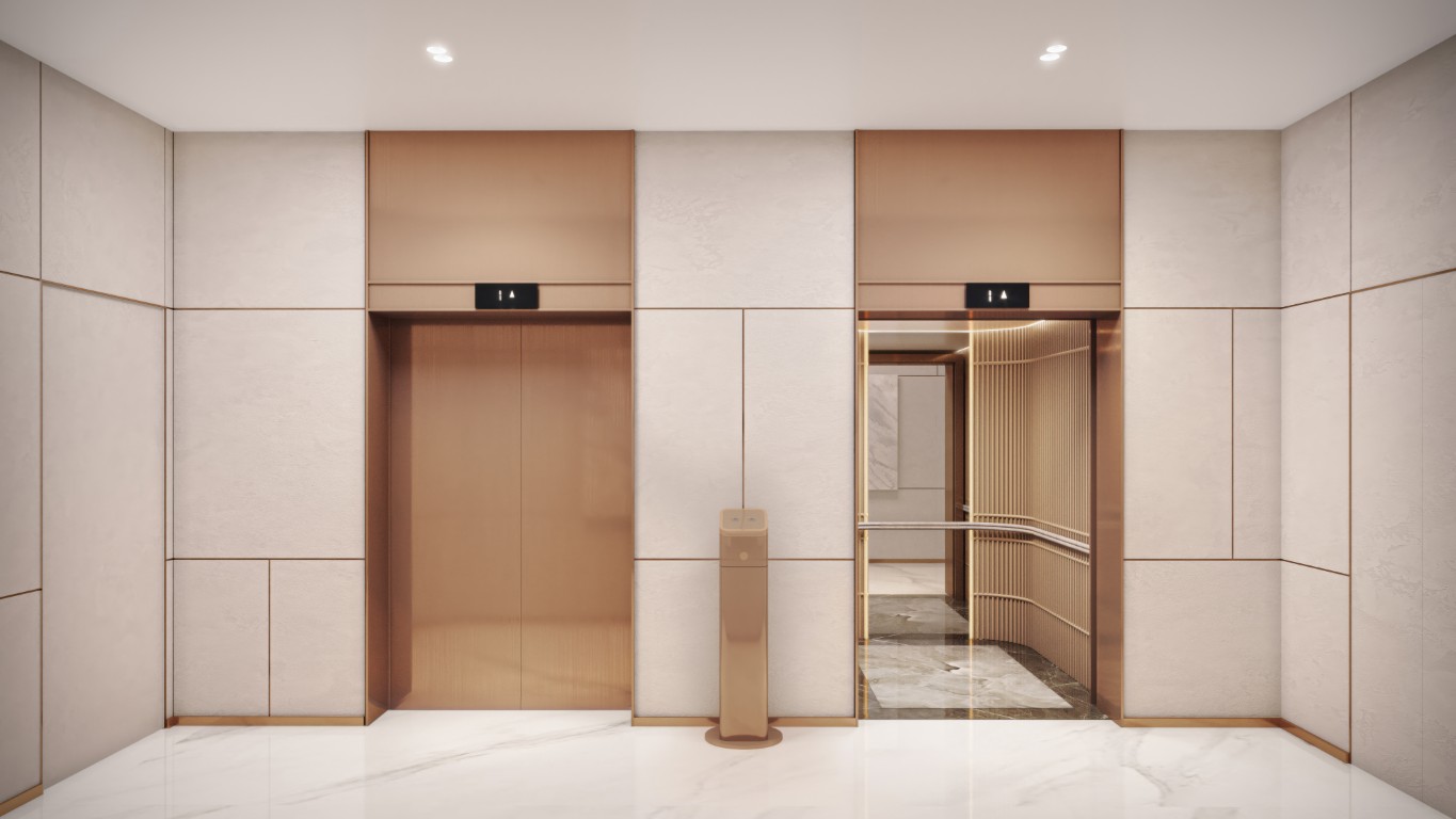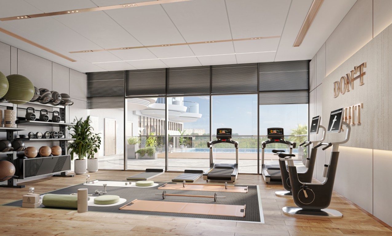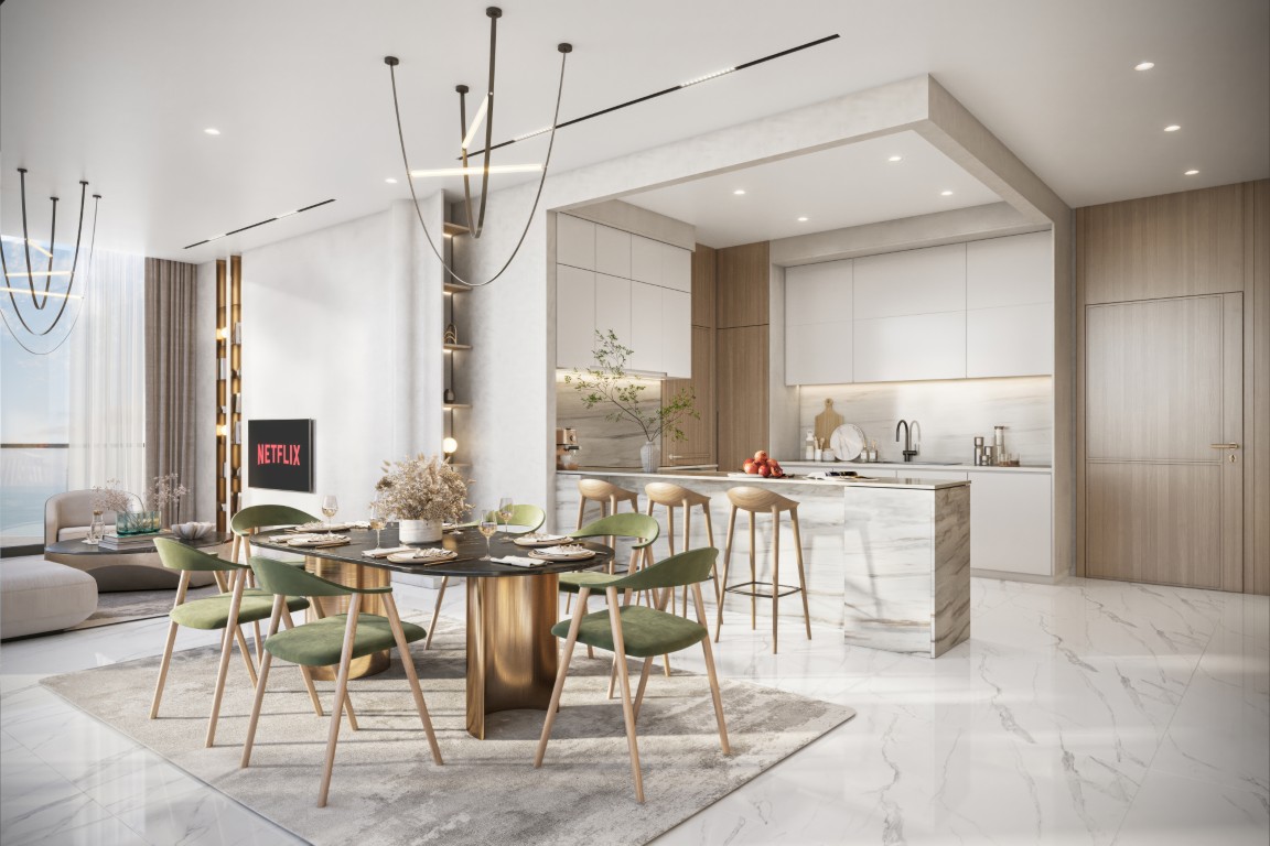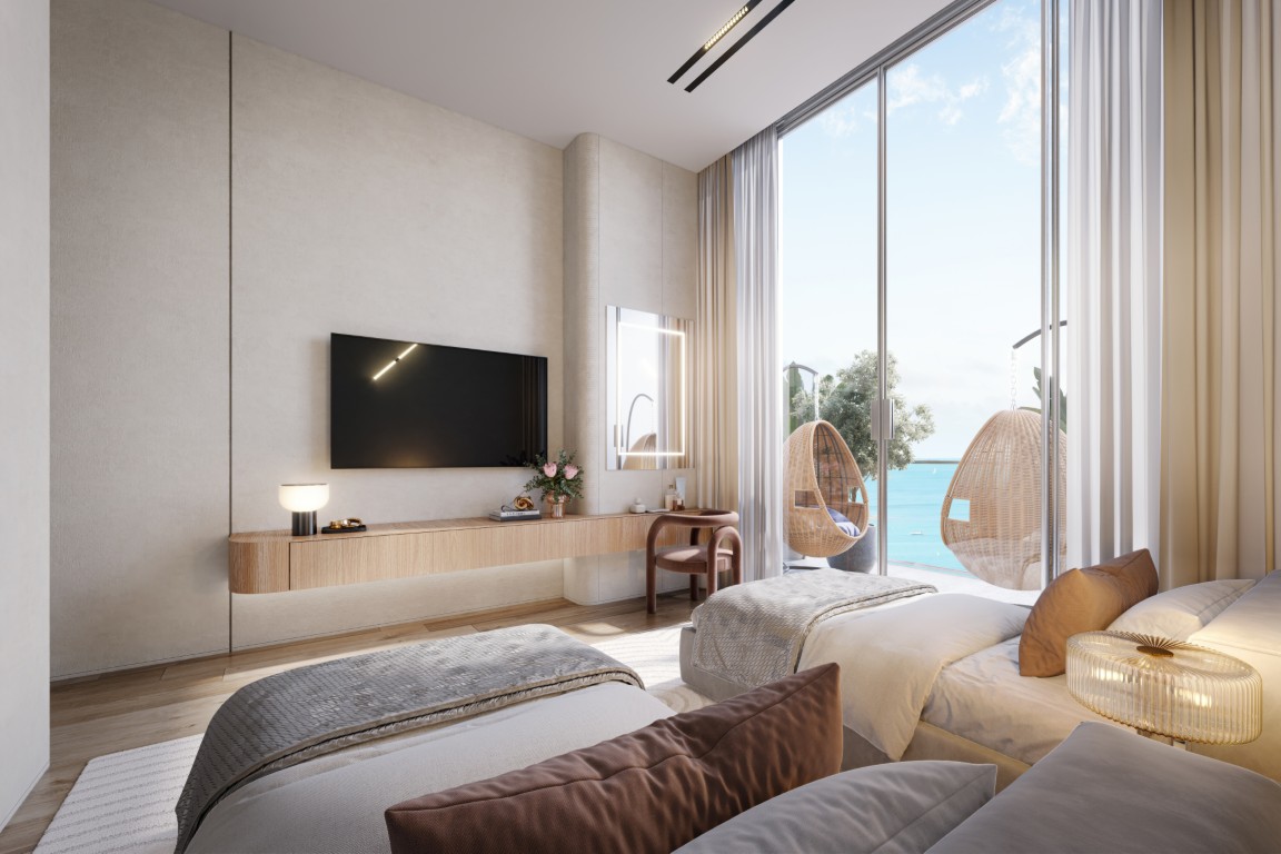 The tower rests on a landscaped podium and features a wave-inspired, balcony-led façade. Subtle lighting and earthly tones lend the building a warm, sophisticated presence, seamlessly connected to its coastal surroundings.